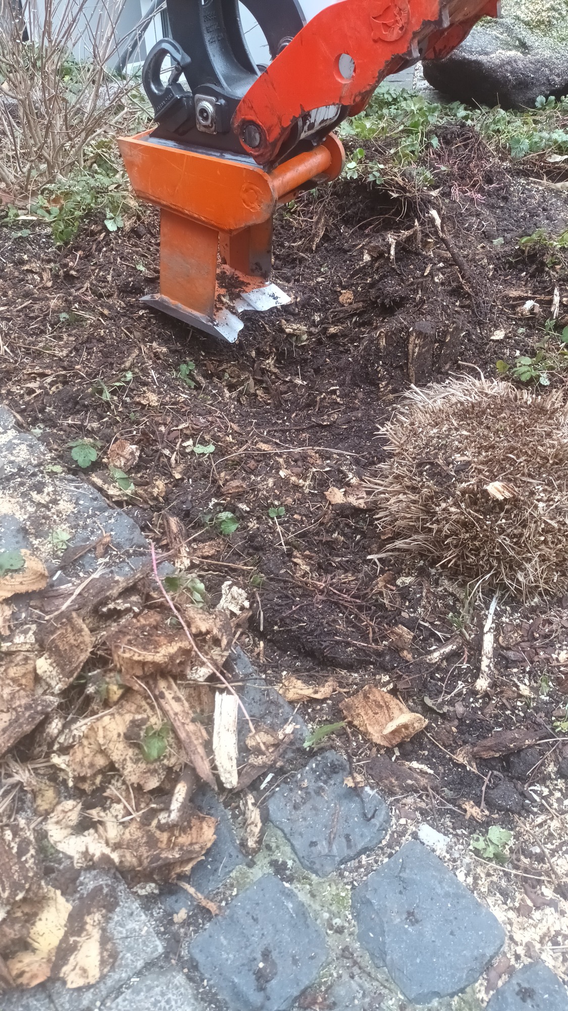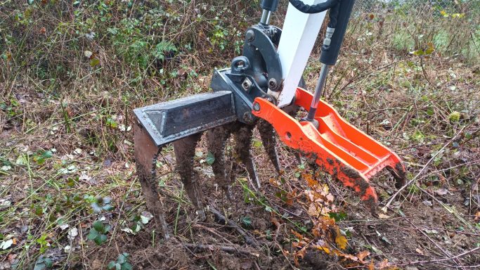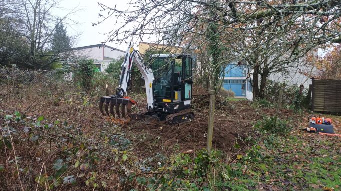 Auch Flächenrodungen sind machbar. Das geschieht effizient mittels Minibagger und Roderechen.